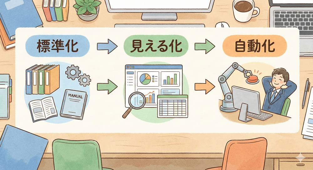 「標準化」「見える化」「自動化」という3つのステップを順番に進めることが、一番の近道になります。