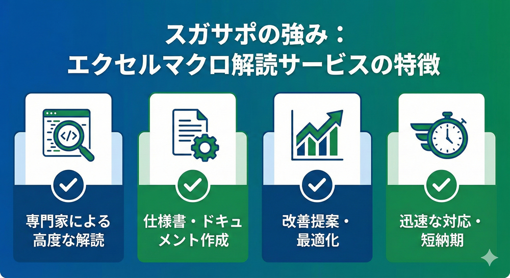 スガサポでは、他人が作ったマクロの解読・修正を専門に承っています。