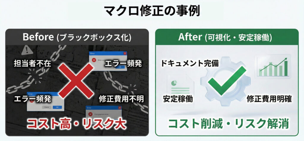 ご相談内容: 毎月の売上集計に使っているマクロ。ある日突然、ボタンを押すと英語のエラーメッセージが出て止まるようになった。担当者はすでに退職しており、誰も原因がわからない。