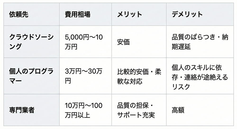 | 比較項目 | クラウドソーシング | システム開発会社 | 個人の専門家 |