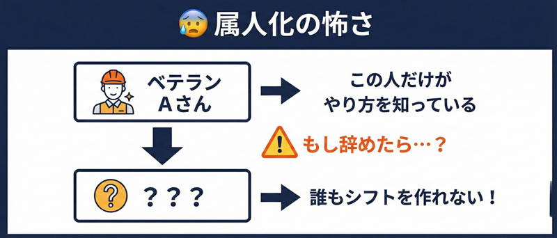 長年シフトを担当してきたベテラン社員さん。その人がいるから、毎月なんとか回っている。でも、もしその人が辞めたら……?